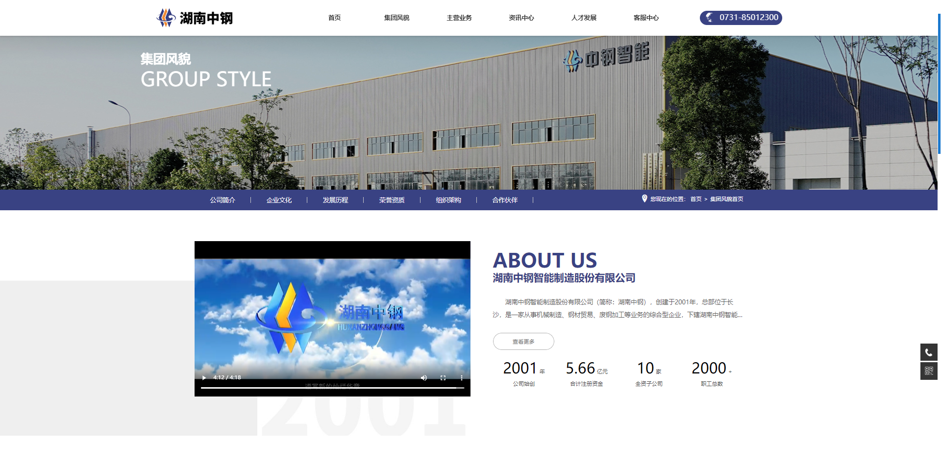 “集团风貌”下设二级栏目“公司简介”、“企业文化”、“发展历程”、“荣誉资质”、“组织架构”、“合作伙伴”,分类展示中钢风采与特色。